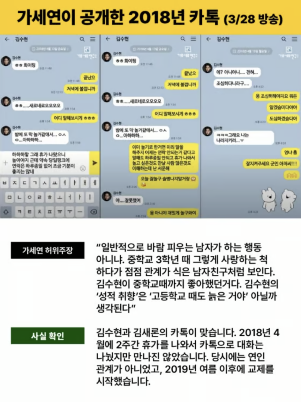 金秀賢方事實確認:這確實是金秀賢和金賽綸的聊天記錄。2018年4月休假兩週,用Kakaotalk聊天,但沒有交往,當時不是戀人關係。2019年夏天後開始交往的。