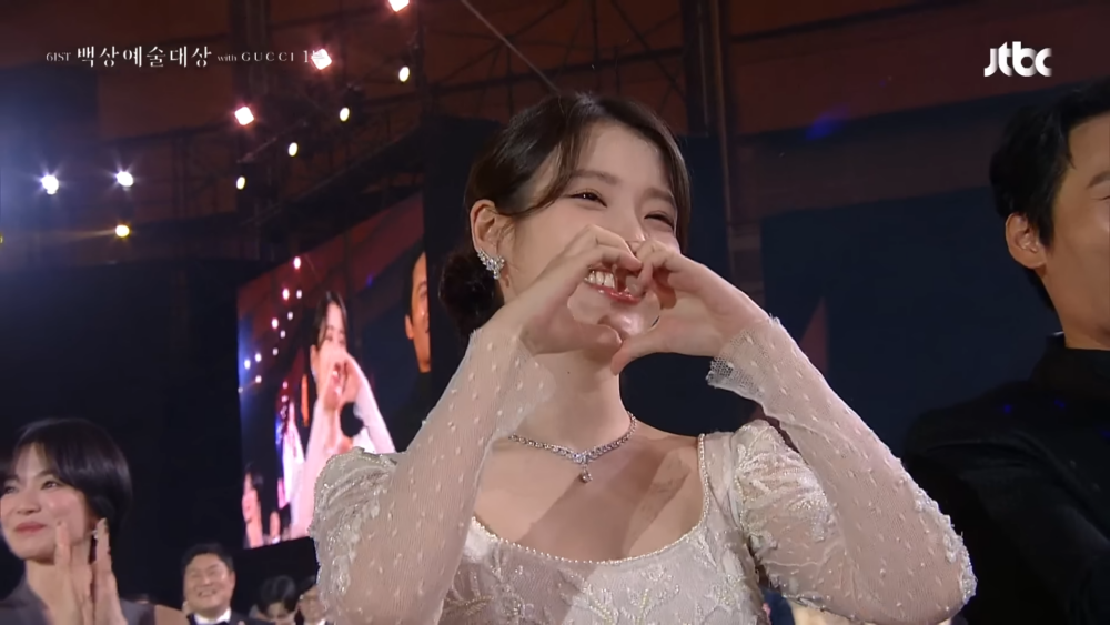 在表演開始前,每位小演員都先進行自我介紹。當天穿著白色小禮服的申彩琳,用著奶音說道:「從我還是兒童演員時期,就教我演技的IU前輩…」話還沒說完,導播馬上切畫面到台下的IU,只見IU被「女兒」一句話萌到不行,整個人瞬間融化,還順勢重現了金宣虎在劇中的經典「歪頭微笑」!