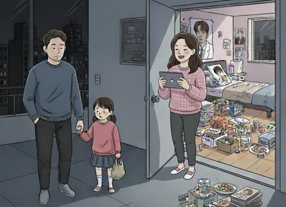 A先生表示:「妻子為了追隨偶像行程,連女兒的上下學都不管,連準備餐食等最基本的育兒與家務也變得怠忽。」他還說:「最近我在主臥衣櫃深處發現了一張以我名義申請的透支帳戶貸款通知書,才知道妻子竟然偷偷拿走我的印章去貸款。」