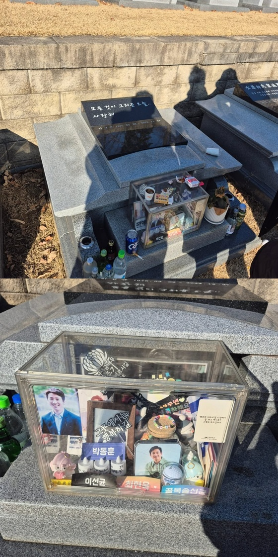 尹熙錫公開的照片中,可見仍有粉絲與親友前往李善均的墓地悼念、留下痕跡,墓碑前有不少粉絲製作的應援物,上面寫著李善均的名字與過往他在經典作品中的角色名(《我的大叔》朴東勳、《料理絕配Pasta》崔賢旭等)。