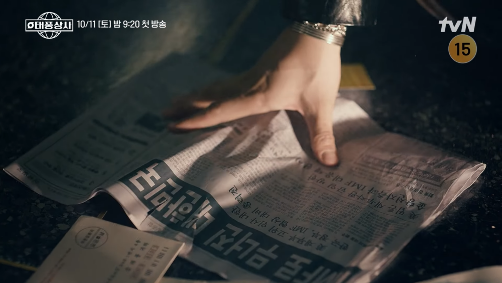而官方近日公開的單人海報,姜颱風所在的地方正是「颱風商社」的辦公室中央。清楚映照出IMF危機帶來的沉重衝擊。然而,姜泰風的臉龐上卻沒有絲毫動搖,反而透出堅定的氣概。他緊緊握著印有「金融救助」黑暗標題的報紙,嘴角帶著笑意,搭配著「我是姜颱風。崩塌的是時代,不是我」的標語,更透露出即便面對可怕的危機也絕不屈服的強大意志!
